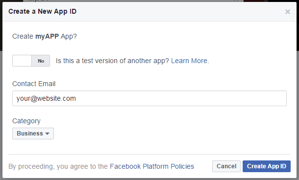 Fill in any name of your new APP. Use a single word without any numbers or special characters and click on Create New Facebook App ID